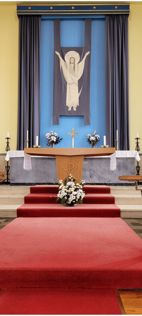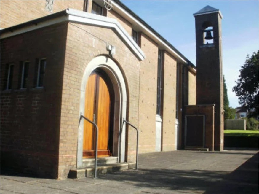 The outside walls are plain brown brick with a low pitched roof. An open bell-tower, projecting from the south wall bears a plain stone cross and contains a tenor bell, a replica of the second bell of St Pauls’s Sketty. Above the main entrance is a small stone statue of St. Micheal weighing souls on the Day of Judgement. This figure was not carved in the traditional way but cast in situ from a wooden mould made to the architect’s full size design.