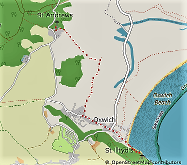- Gan adael mynwent yr eglwys yn Oxwich, dilynwch y llwybr i bentref Oxwich ac ewch yn syth ymlaen wrth y groesffordd.