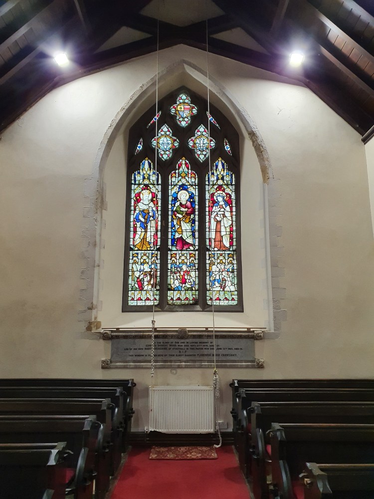 The church is endowed with impressive stained glass ornament from the C19 and C20. In the chancel the two-light east window show scenes of the Resurrection, A south window shows the Annunciation scene of the Virgin Mary and a north window depicts St George and St David. An east window in the transept shows Jesus as the Lamb of God, with the banner of the resurrection and on the north side a memorial with scenes of the resurrection. On the south side of the nave the central light of the window was stained by Swansea’s Celtic Studios and depicts Dorcas ‘full of good works and acts of charity’. The predominant feature of the nave is the large west window with very fine stained glass designed by Nathaniel Westlake (1833-1921) the well known art historian and designer from London. This was presented in 1905 by Mrs F M Crawshay of Cyfarthfa Castle in memory of her parents, Colonel and Mrs Wood of Stouthall.