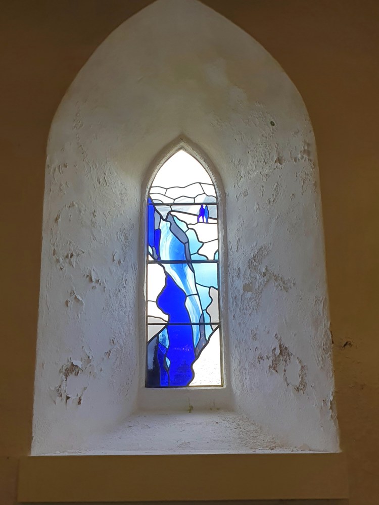 St Mary’s possesses a number of fine stained glass windows, in memory of both clergy and local church members. A very striking addition in 2006 was given by the artist to commemorate Rhossili-born, Edgar Evans who died in 1912 with Captain Scott on the return journey from the South Pole. On the north wall, the white marble memorial tablet to him was given by his wife Lois, also from the village, and bears the inscription ‘To seek, to strive, to find and not to yield’. In the chancel is a brass tablet dedicated to the C19 Rector Lucas who ‘loved this church and parish’.