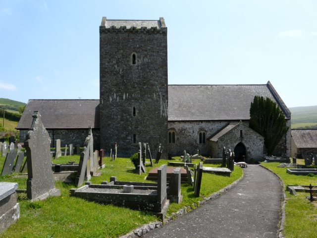 This 12th century church is on the site of a 6th century llan, or churchyard, which retains the original circular footprint. The floor was raised and the interior subjected to careful Victorian remodelling. In the south wall are the remains of a medieval doorway to the cloisters of the adjoining monastery/priory, and in the rear of the chancel arch is evidence of a rood-stair. There is a knight’s effigy said to be of the de la Mere family, known as ‘the Dolly Mare’. On the chancel arch has been placed a 9th century grave-slab with intricate knotwork carvings, believed to have marked the grave of St Cenydd who founded the llan, and the associated cell on nearby Burry Holms. The 20th century lych gate, font lid, frontals chest and other items of church furniture have interesting carvings by local craftsman William Melling. In the graveyard are buried celebrated Gower folksinger Phil Tanner, and Battle of Britain hero Wing Cdr Tony Eyre.