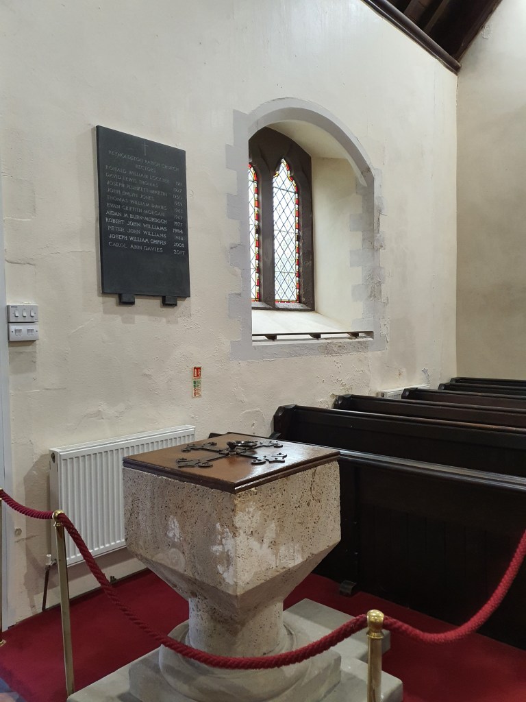 The dedication to St George is a reminder of the Anglo/Norman influence in this part of Gower: the figure of St George slaying the dragon is carved in relief on the stone pulpit. A church has stood on this site since the early 13th century. The present building dates from the mid-1860s, and is a fine example of Victorian Gothic architecture. There is a wealth of stained glass, including the three-light west window designed by Nathaniel Westlake in 1905. The transept contains many tombstones and memorial plaques from the old church, mostly to members of the Lucas family. Standing near the chancel arch is a pillar cross, one of the earliest Christian monuments in Gower, being probably 9th century. The Norman font is carved from a single block of stalagmite.