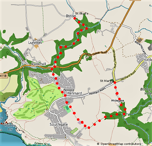 - Turn left and follow the bridleway through Hael Farm and then down through woods into Bishopston Valley.